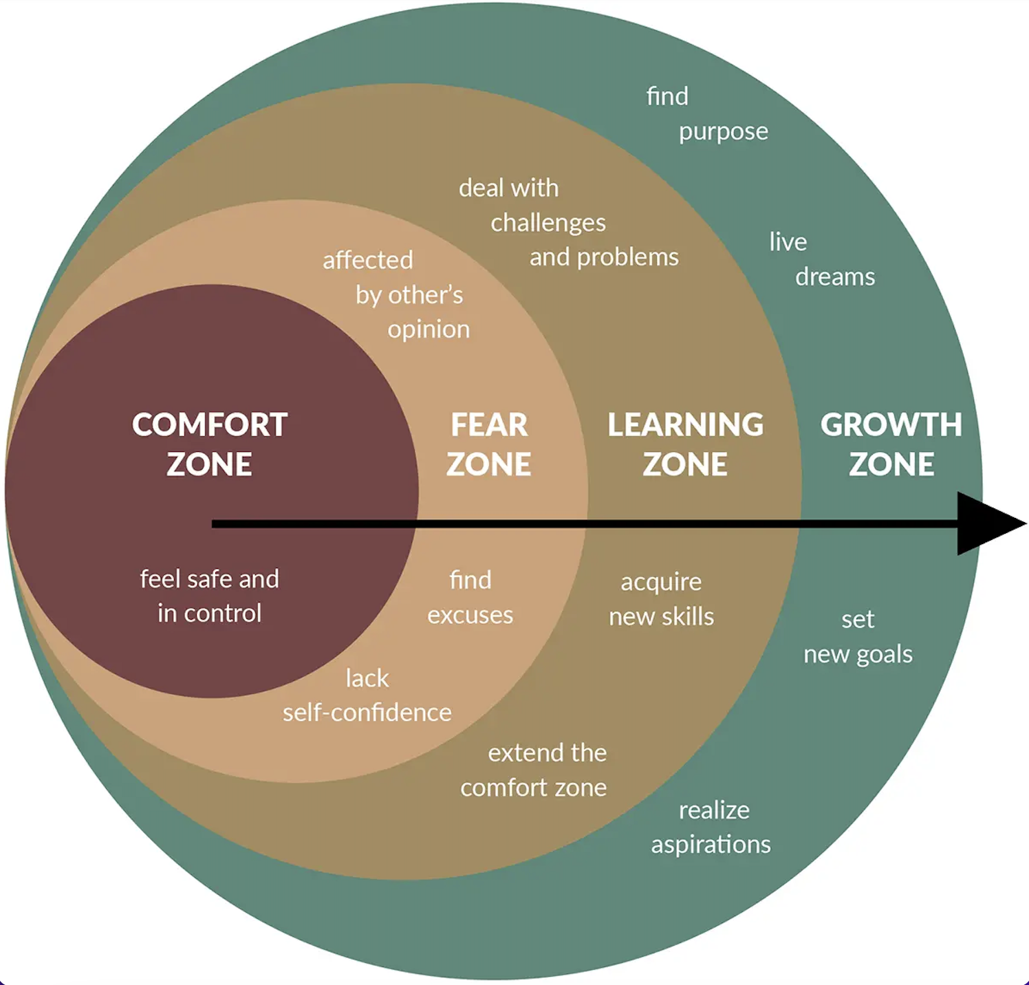 How many of us prefer to stay in our comfort zone? All of us, of course. It is a wonderful place to be. It is where we feel safe and inherently where our brain tells us we should stay. However, if we allow ourselves to consider the more scary zones, look at the benefits.