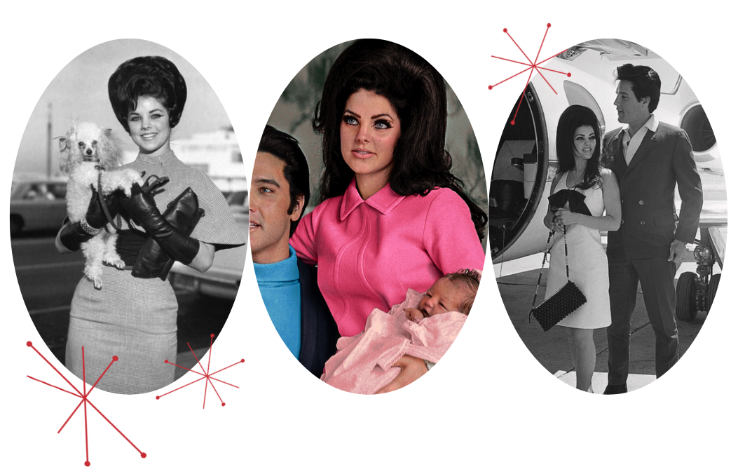 Pompadour’s slicked with gel, back combed beehive style do’s, accompanied by extended cat eye eyeliner, defined eyebrows, and nude lip where calling cards of Elvis and Priscilla’s looks.