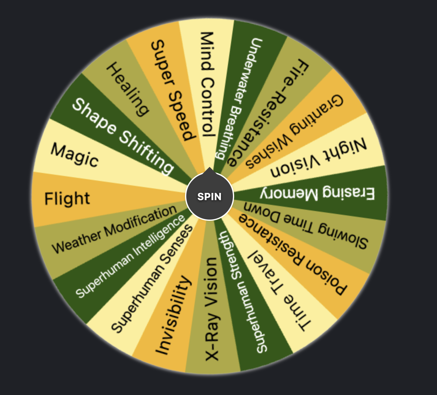 2. Each spin will reveal your superhero powers. If you land on the same superhero skill twice, play again.