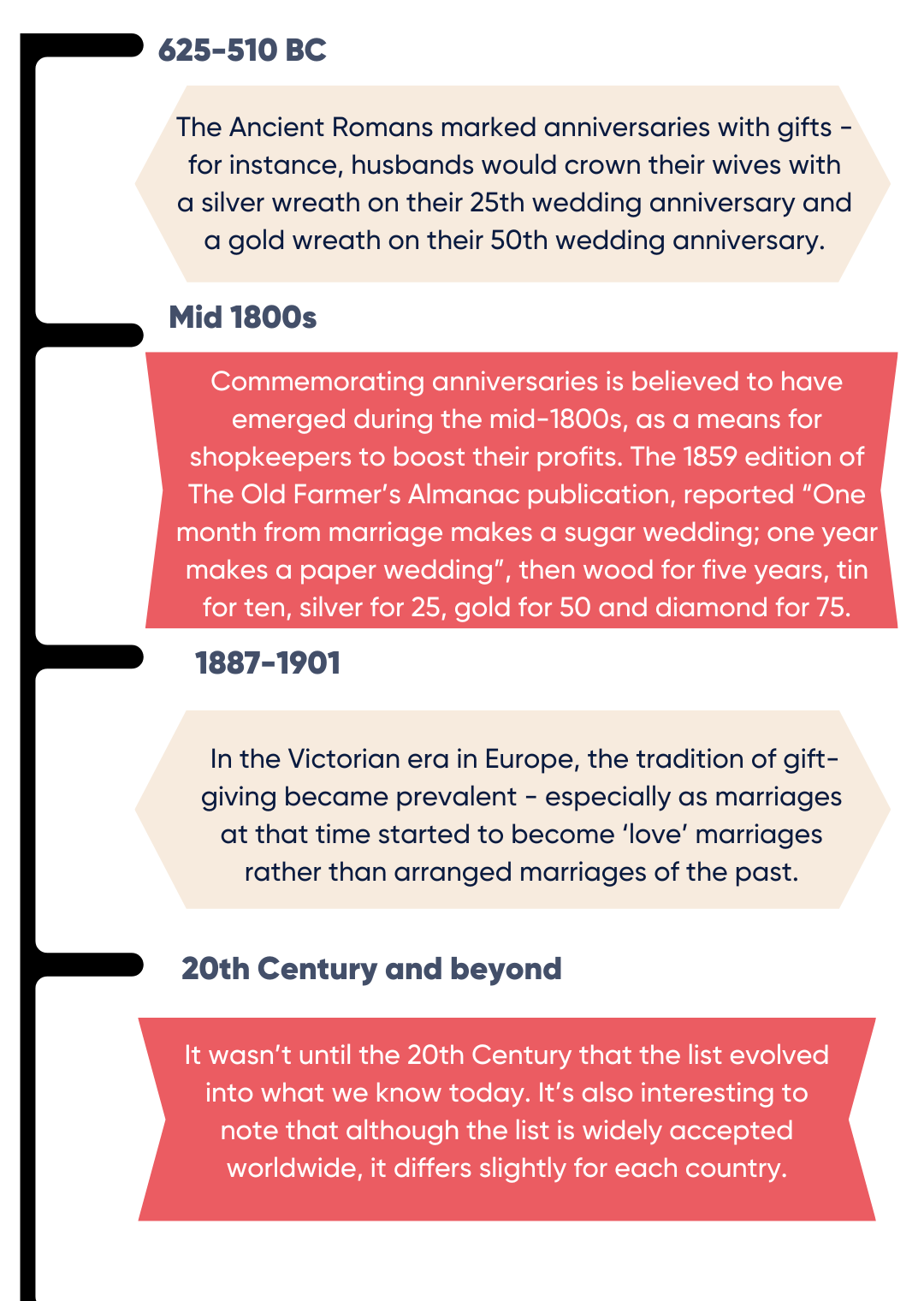 Wedding anniversary traditions have very old and ancient roots and although they have evolved over time, they can be traced back thousands of years. It’s fascinating to think that ancient Romans were having golden wedding anniversary celebrations just like we do now.